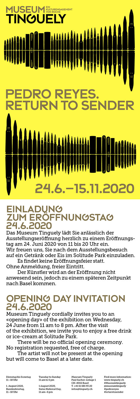 Nach diesen ausserordentlichen «Corona-Wochen» freuen wir uns, Ihnen heute die bevorstehende Eröffnung der Ausstellung PEDRO REYES. RETURN TO SENDER (24.06.-15.11.2020) ankündigen zu können. Um die nach wie vor für Museen und Veranstaltungen geltenden Schutzauflagen gewährleisten zu können, laden wir Sie als Medienvertretende herzlich ein: